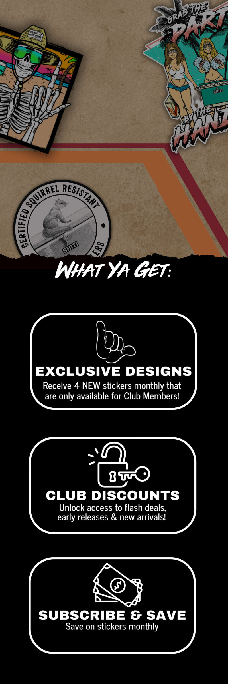 Subscribe now and get 4 exclusive stickers every month that ya can't get anywhere else, even on our website! These stickers are designed in house by the SHITI Team and are only available for Club Members. This subsciption also includes access to Club Discounts for site-wide gear, flashdeals & early release Here's to gettin' SHITI for years to come, Cheers!